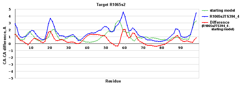 | Green line: distance between the aligned CA atoms in the starting model and the experimental structure in the LGA sequence-independent superposition under the 4A distance cutoff (see LGA description). |