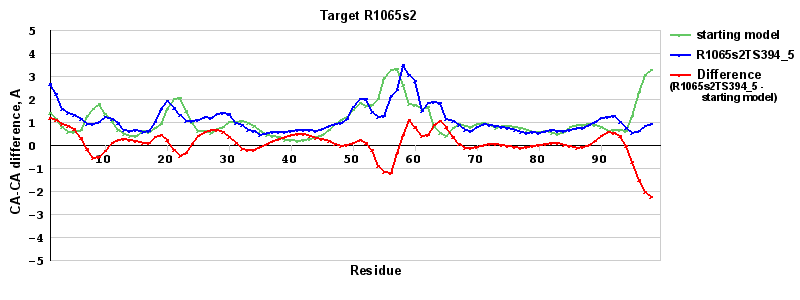 | Red line = (blue line) - (green thick line): difference between the corresponding Refined Model-Target and Starting Model-Target CA-CA distances (see above). Negative values show regions where the reifned model has better fit to the target than the starting model, i.e. areas of potential improvement. |