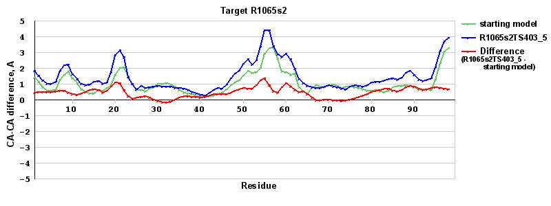 | Red line = (blue line) - (green thick line): difference between the corresponding Refined Model-Target and Starting Model-Target CA-CA distances (see above). Negative values show regions where the reifned model has better fit to the target than the starting model, i.e. areas of potential improvement. |