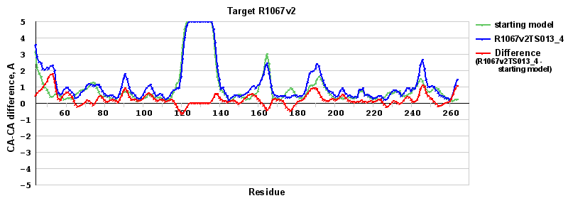 | Green line: distance between the aligned CA atoms in the starting model and the experimental structure in the LGA sequence-independent superposition under the 4A distance cutoff (see LGA description). |