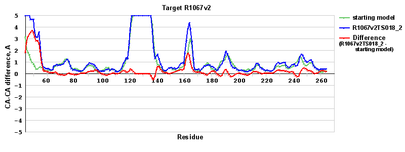 | Red line = (blue line) - (green thick line): difference between the corresponding Refined Model-Target and Starting Model-Target CA-CA distances (see above). Negative values show regions where the reifned model has better fit to the target than the starting model, i.e. areas of potential improvement. |