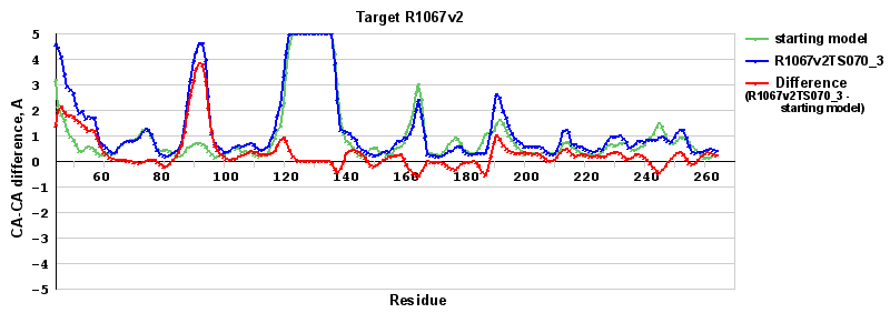 | Red line = (blue line) - (green thick line): difference between the corresponding Refined Model-Target and Starting Model-Target CA-CA distances (see above). Negative values show regions where the reifned model has better fit to the target than the starting model, i.e. areas of potential improvement. |