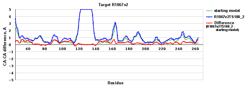 | Red line = (blue line) - (green thick line): difference between the corresponding Refined Model-Target and Starting Model-Target CA-CA distances (see above). Negative values show regions where the reifned model has better fit to the target than the starting model, i.e. areas of potential improvement. |