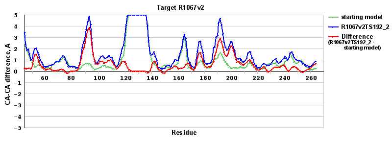 | Red line = (blue line) - (green thick line): difference between the corresponding Refined Model-Target and Starting Model-Target CA-CA distances (see above). Negative values show regions where the reifned model has better fit to the target than the starting model, i.e. areas of potential improvement. |