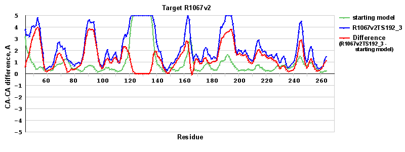 | Red line = (blue line) - (green thick line): difference between the corresponding Refined Model-Target and Starting Model-Target CA-CA distances (see above). Negative values show regions where the reifned model has better fit to the target than the starting model, i.e. areas of potential improvement. |