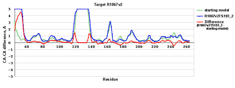 | Red line = (blue line) - (green thick line): difference between the corresponding Refined Model-Target and Starting Model-Target CA-CA distances (see above). Negative values show regions where the reifned model has better fit to the target than the starting model, i.e. areas of potential improvement. |