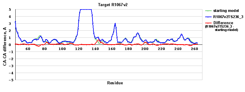 | Green line: distance between the aligned CA atoms in the starting model and the experimental structure in the LGA sequence-independent superposition under the 4A distance cutoff (see LGA description). |