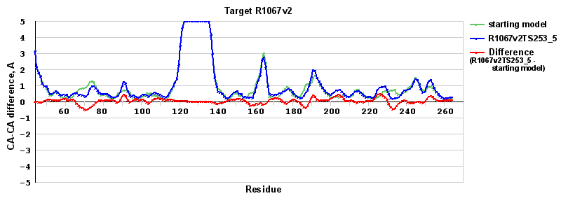 | Red line = (blue line) - (green thick line): difference between the corresponding Refined Model-Target and Starting Model-Target CA-CA distances (see above). Negative values show regions where the reifned model has better fit to the target than the starting model, i.e. areas of potential improvement. |