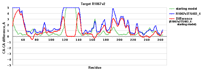 | Green line: distance between the aligned CA atoms in the starting model and the experimental structure in the LGA sequence-independent superposition under the 4A distance cutoff (see LGA description). |