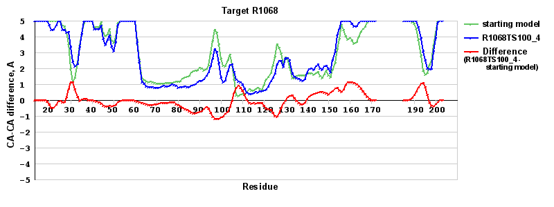 | Red line = (blue line) - (green thick line): difference between the corresponding Refined Model-Target and Starting Model-Target CA-CA distances (see above). Negative values show regions where the reifned model has better fit to the target than the starting model, i.e. areas of potential improvement. |
