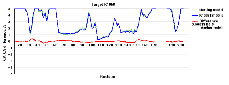 | Red line = (blue line) - (green thick line): difference between the corresponding Refined Model-Target and Starting Model-Target CA-CA distances (see above). Negative values show regions where the reifned model has better fit to the target than the starting model, i.e. areas of potential improvement. |