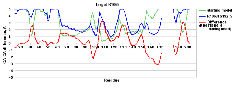| Red line = (blue line) - (green thick line): difference between the corresponding Refined Model-Target and Starting Model-Target CA-CA distances (see above). Negative values show regions where the reifned model has better fit to the target than the starting model, i.e. areas of potential improvement. |