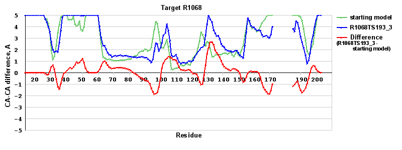 | Red line = (blue line) - (green thick line): difference between the corresponding Refined Model-Target and Starting Model-Target CA-CA distances (see above). Negative values show regions where the reifned model has better fit to the target than the starting model, i.e. areas of potential improvement. |