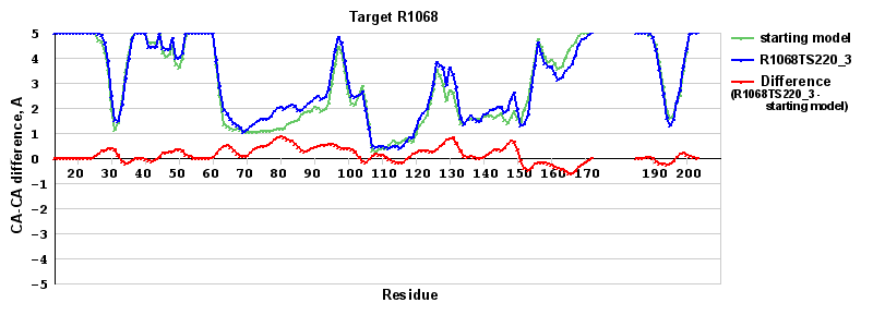 | Red line = (blue line) - (green thick line): difference between the corresponding Refined Model-Target and Starting Model-Target CA-CA distances (see above). Negative values show regions where the reifned model has better fit to the target than the starting model, i.e. areas of potential improvement. |