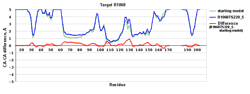 | Red line = (blue line) - (green thick line): difference between the corresponding Refined Model-Target and Starting Model-Target CA-CA distances (see above). Negative values show regions where the reifned model has better fit to the target than the starting model, i.e. areas of potential improvement. |