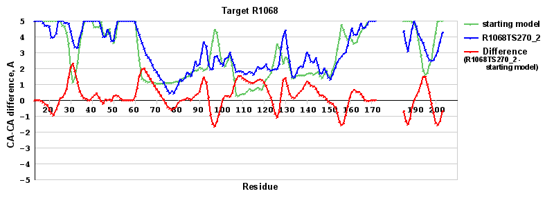 | Red line = (blue line) - (green thick line): difference between the corresponding Refined Model-Target and Starting Model-Target CA-CA distances (see above). Negative values show regions where the reifned model has better fit to the target than the starting model, i.e. areas of potential improvement. |