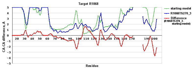 | Red line = (blue line) - (green thick line): difference between the corresponding Refined Model-Target and Starting Model-Target CA-CA distances (see above). Negative values show regions where the reifned model has better fit to the target than the starting model, i.e. areas of potential improvement. |