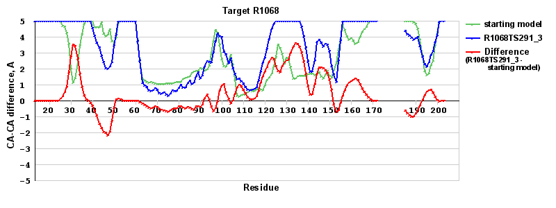 | Red line = (blue line) - (green thick line): difference between the corresponding Refined Model-Target and Starting Model-Target CA-CA distances (see above). Negative values show regions where the reifned model has better fit to the target than the starting model, i.e. areas of potential improvement. |