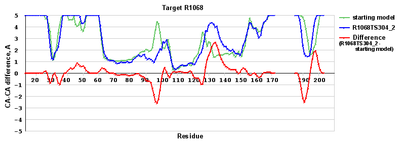 | Red line = (blue line) - (green thick line): difference between the corresponding Refined Model-Target and Starting Model-Target CA-CA distances (see above). Negative values show regions where the reifned model has better fit to the target than the starting model, i.e. areas of potential improvement. |