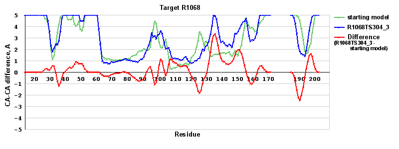 | Red line = (blue line) - (green thick line): difference between the corresponding Refined Model-Target and Starting Model-Target CA-CA distances (see above). Negative values show regions where the reifned model has better fit to the target than the starting model, i.e. areas of potential improvement. |