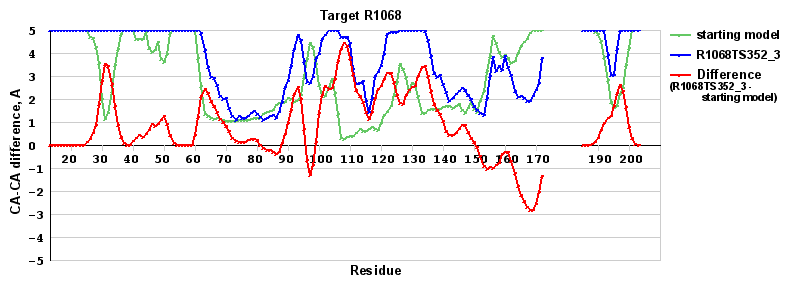 | Red line = (blue line) - (green thick line): difference between the corresponding Refined Model-Target and Starting Model-Target CA-CA distances (see above). Negative values show regions where the reifned model has better fit to the target than the starting model, i.e. areas of potential improvement. |