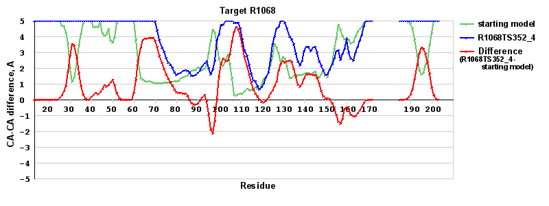 | Red line = (blue line) - (green thick line): difference between the corresponding Refined Model-Target and Starting Model-Target CA-CA distances (see above). Negative values show regions where the reifned model has better fit to the target than the starting model, i.e. areas of potential improvement. |