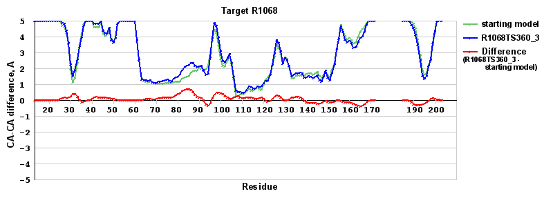 | Red line = (blue line) - (green thick line): difference between the corresponding Refined Model-Target and Starting Model-Target CA-CA distances (see above). Negative values show regions where the reifned model has better fit to the target than the starting model, i.e. areas of potential improvement. |