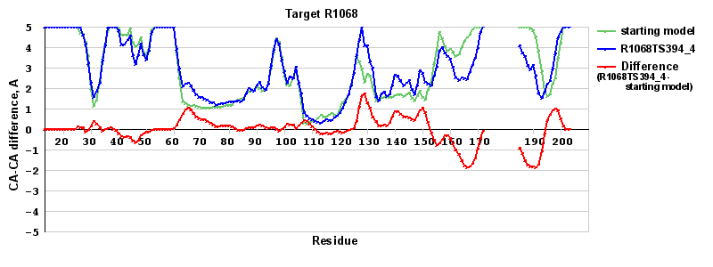 | Red line = (blue line) - (green thick line): difference between the corresponding Refined Model-Target and Starting Model-Target CA-CA distances (see above). Negative values show regions where the reifned model has better fit to the target than the starting model, i.e. areas of potential improvement. |
