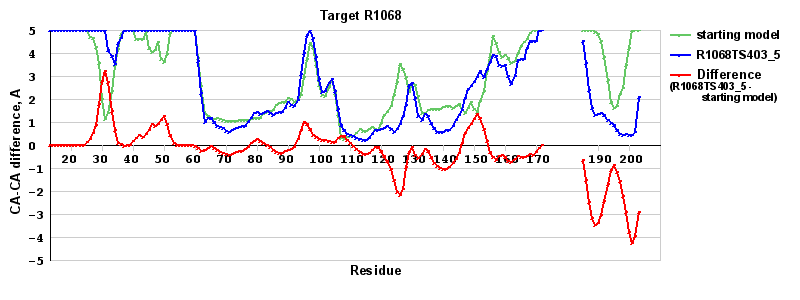 | Red line = (blue line) - (green thick line): difference between the corresponding Refined Model-Target and Starting Model-Target CA-CA distances (see above). Negative values show regions where the reifned model has better fit to the target than the starting model, i.e. areas of potential improvement. |