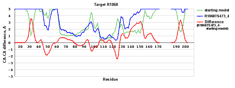 | Red line = (blue line) - (green thick line): difference between the corresponding Refined Model-Target and Starting Model-Target CA-CA distances (see above). Negative values show regions where the reifned model has better fit to the target than the starting model, i.e. areas of potential improvement. |