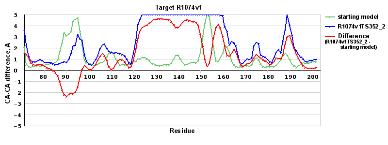| Red line = (blue line) - (green thick line): difference between the corresponding Refined Model-Target and Starting Model-Target CA-CA distances (see above). Negative values show regions where the reifned model has better fit to the target than the starting model, i.e. areas of potential improvement. |