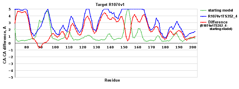 | Red line = (blue line) - (green thick line): difference between the corresponding Refined Model-Target and Starting Model-Target CA-CA distances (see above). Negative values show regions where the reifned model has better fit to the target than the starting model, i.e. areas of potential improvement. |