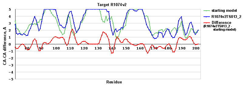 | Red line = (blue line) - (green thick line): difference between the corresponding Refined Model-Target and Starting Model-Target CA-CA distances (see above). Negative values show regions where the reifned model has better fit to the target than the starting model, i.e. areas of potential improvement. |