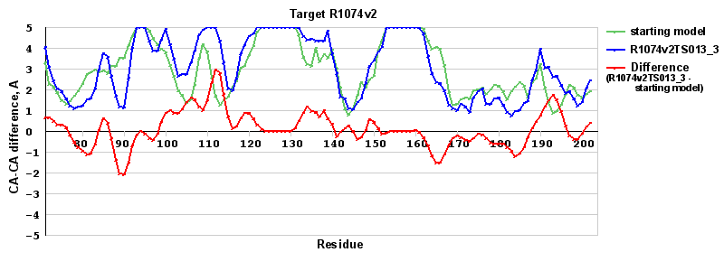 | Red line = (blue line) - (green thick line): difference between the corresponding Refined Model-Target and Starting Model-Target CA-CA distances (see above). Negative values show regions where the reifned model has better fit to the target than the starting model, i.e. areas of potential improvement. |