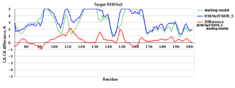 | Red line = (blue line) - (green thick line): difference between the corresponding Refined Model-Target and Starting Model-Target CA-CA distances (see above). Negative values show regions where the reifned model has better fit to the target than the starting model, i.e. areas of potential improvement. |