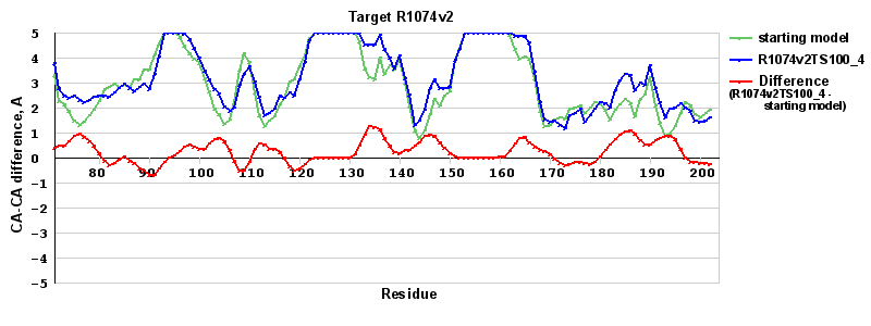 | Red line = (blue line) - (green thick line): difference between the corresponding Refined Model-Target and Starting Model-Target CA-CA distances (see above). Negative values show regions where the reifned model has better fit to the target than the starting model, i.e. areas of potential improvement. |