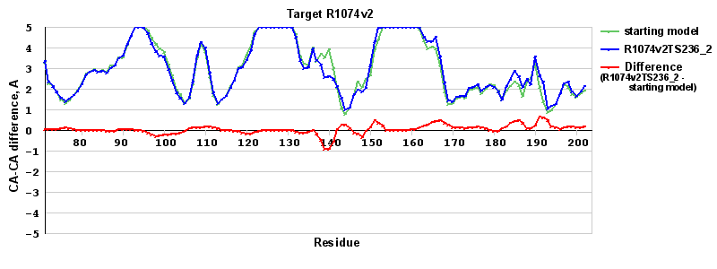 | Red line = (blue line) - (green thick line): difference between the corresponding Refined Model-Target and Starting Model-Target CA-CA distances (see above). Negative values show regions where the reifned model has better fit to the target than the starting model, i.e. areas of potential improvement. |
