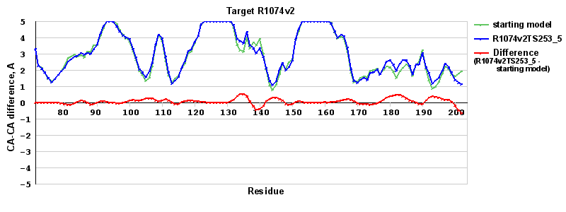 | Red line = (blue line) - (green thick line): difference between the corresponding Refined Model-Target and Starting Model-Target CA-CA distances (see above). Negative values show regions where the reifned model has better fit to the target than the starting model, i.e. areas of potential improvement. |