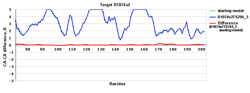 | Red line = (blue line) - (green thick line): difference between the corresponding Refined Model-Target and Starting Model-Target CA-CA distances (see above). Negative values show regions where the reifned model has better fit to the target than the starting model, i.e. areas of potential improvement. |