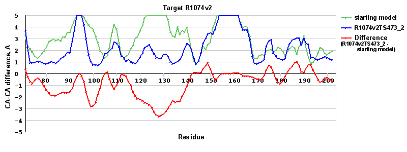 | Red line = (blue line) - (green thick line): difference between the corresponding Refined Model-Target and Starting Model-Target CA-CA distances (see above). Negative values show regions where the reifned model has better fit to the target than the starting model, i.e. areas of potential improvement. |