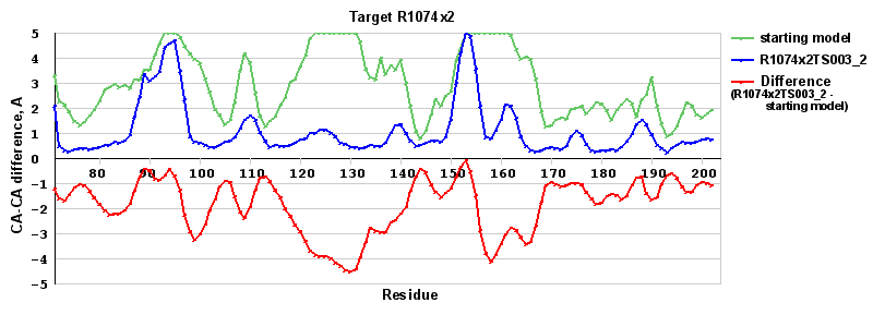 | Red line = (blue line) - (green thick line): difference between the corresponding Refined Model-Target and Starting Model-Target CA-CA distances (see above). Negative values show regions where the reifned model has better fit to the target than the starting model, i.e. areas of potential improvement. |