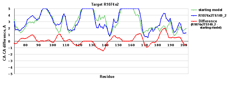 | Red line = (blue line) - (green thick line): difference between the corresponding Refined Model-Target and Starting Model-Target CA-CA distances (see above). Negative values show regions where the reifned model has better fit to the target than the starting model, i.e. areas of potential improvement. |