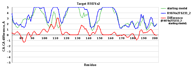 | Red line = (blue line) - (green thick line): difference between the corresponding Refined Model-Target and Starting Model-Target CA-CA distances (see above). Negative values show regions where the reifned model has better fit to the target than the starting model, i.e. areas of potential improvement. |