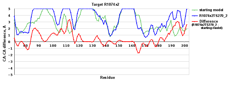 | Red line = (blue line) - (green thick line): difference between the corresponding Refined Model-Target and Starting Model-Target CA-CA distances (see above). Negative values show regions where the reifned model has better fit to the target than the starting model, i.e. areas of potential improvement. |