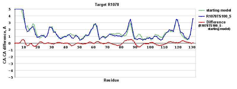 | Red line = (blue line) - (green thick line): difference between the corresponding Refined Model-Target and Starting Model-Target CA-CA distances (see above). Negative values show regions where the reifned model has better fit to the target than the starting model, i.e. areas of potential improvement. |