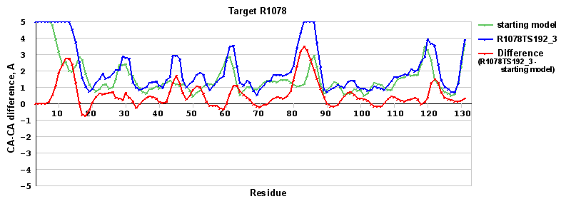 | Red line = (blue line) - (green thick line): difference between the corresponding Refined Model-Target and Starting Model-Target CA-CA distances (see above). Negative values show regions where the reifned model has better fit to the target than the starting model, i.e. areas of potential improvement. |