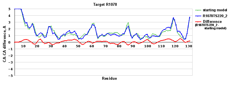 | Blue line: distance between the corresponding CA atoms in a refined model and the experimental structure in the LGA sequence-independent superposition under the 4A distance cutoff. |