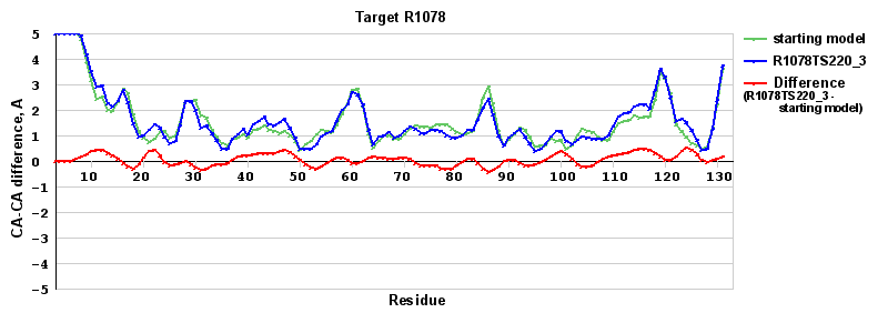 | Red line = (blue line) - (green thick line): difference between the corresponding Refined Model-Target and Starting Model-Target CA-CA distances (see above). Negative values show regions where the reifned model has better fit to the target than the starting model, i.e. areas of potential improvement. |