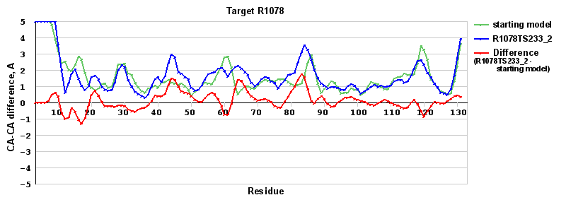 | Red line = (blue line) - (green thick line): difference between the corresponding Refined Model-Target and Starting Model-Target CA-CA distances (see above). Negative values show regions where the reifned model has better fit to the target than the starting model, i.e. areas of potential improvement. |