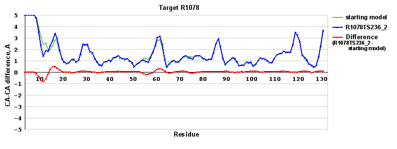 | Red line = (blue line) - (green thick line): difference between the corresponding Refined Model-Target and Starting Model-Target CA-CA distances (see above). Negative values show regions where the reifned model has better fit to the target than the starting model, i.e. areas of potential improvement. |